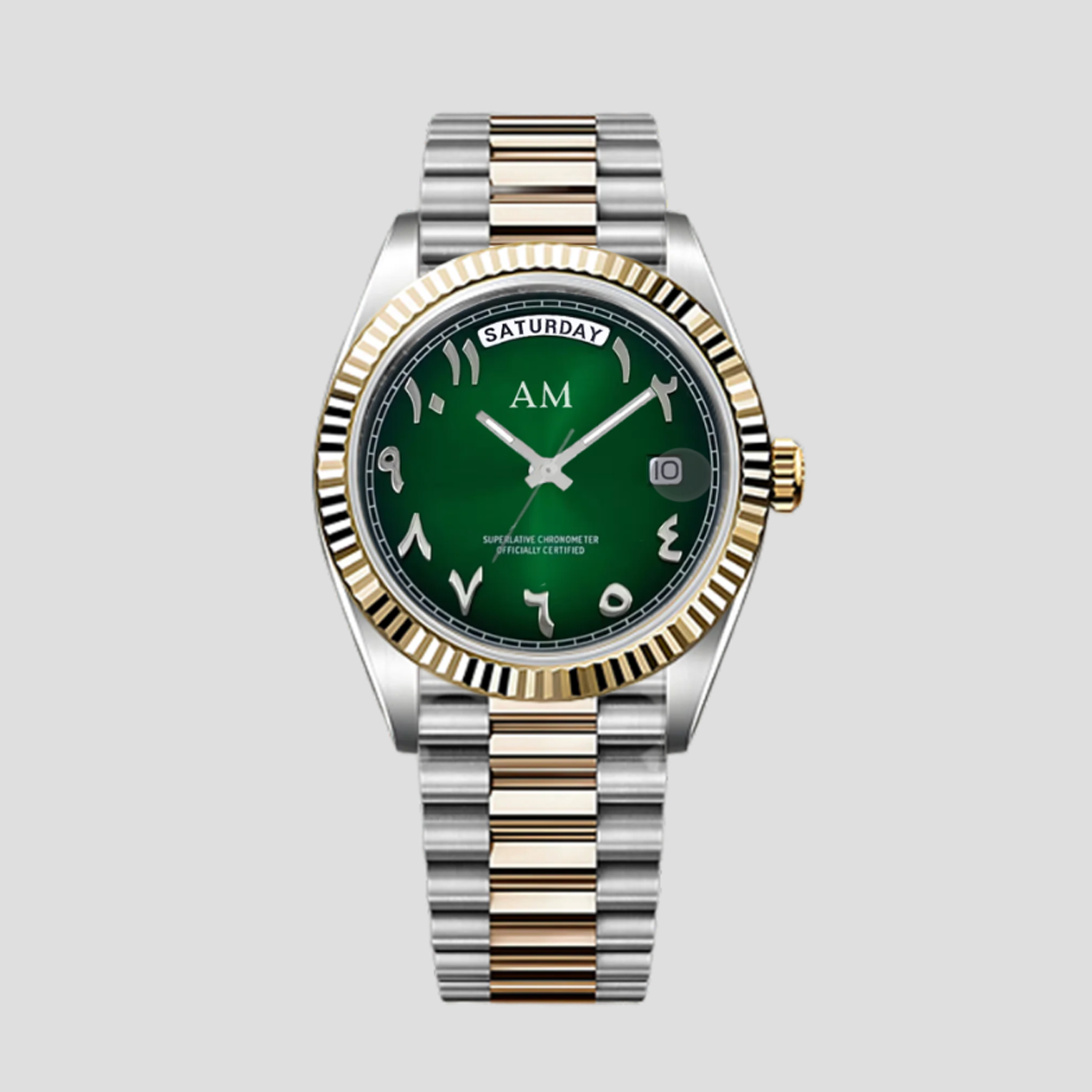 Oto model Day-Date Arabic Two Tone Green – Zainspirowany kultowym designem Day-Date i wyposażony w renomowany mechanizm Miyota 8285. To zegarek klasy premium, który łączy doskonałość wykonania z niezawodnością.